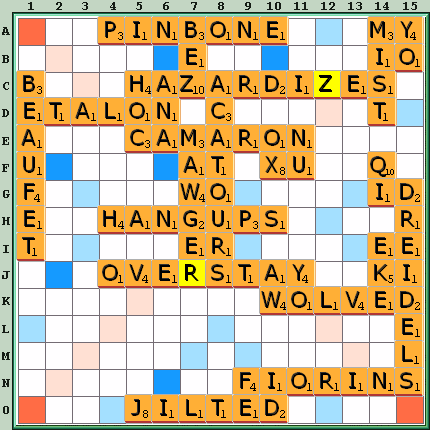 Other moves: L*ZLEZ 7A 43, ABLAZE C8 40, BLAZES 10C 37, BLAZES J3 37, MAZE G3 36