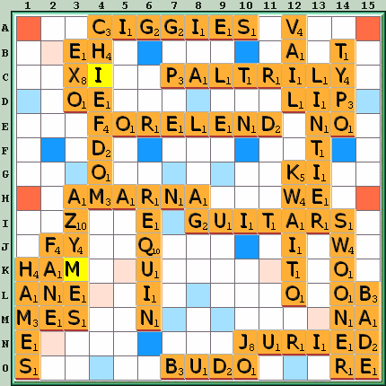 Other moves: CIGGIE A4 30, GRICES A1 27, GRICE A1 24, SIGHER B1 24, FISGIG E4 22