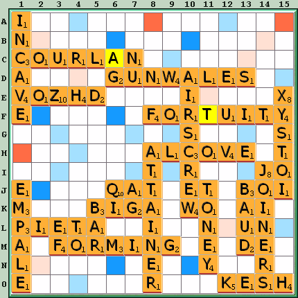 Other moves: (E)NCOLURE N1 72, UNCLE(A)NER M7 28, COLUR(E) E3 24, CONUR(E) E3 24, CRUX E12 23