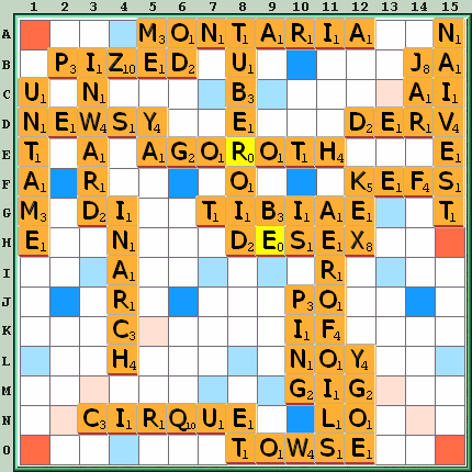 Other moves: PHIZ D2 47, ZO I9 47, PIZED D1 43, EPHOD B2 41, HOPED B2 41