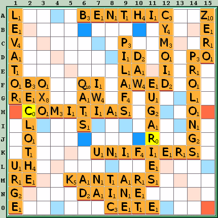 Other moves: GLOOP H11 27, OOP 13B 27, PO(R)NO J9 23, GO(R)P J9 22, OON 13B 21