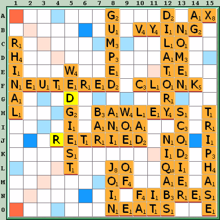 Other moves: DECISORY 12A 82, DISCOER 13F 79, CROWDIES E2 64, SCORED 13H 39, SCRIED 13H 39