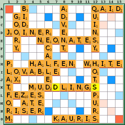 Other moves: QUINS 12A 48, QI C3 46, QI G13 44, INQUIRY 9G 34, QUIT 10B 33
