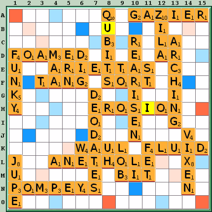 Other moves: Q(U)IET 8A 42, Q(U)ILT 8A 42, QI(S) 14F 37, M(A)BE F4 36, BL(A)ME F3 35
