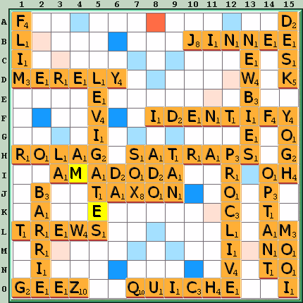 Other moves: RENEY 4A 27, MENE E8 25, MENU E8 25, MERE E8 25, EYE E9 24