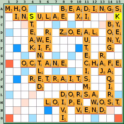 Other moves: NEUMATIC 13A 76, NEUMATIC G5 73, MUTICATE 10D 64, MUTICATE 10H 64, ETACISM 11E 44