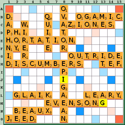 Other moves: QUOIF 11K 34, QUOIF 5G 34, QUIT 6B 33, QIS 10F 32, SUQ 10H 32